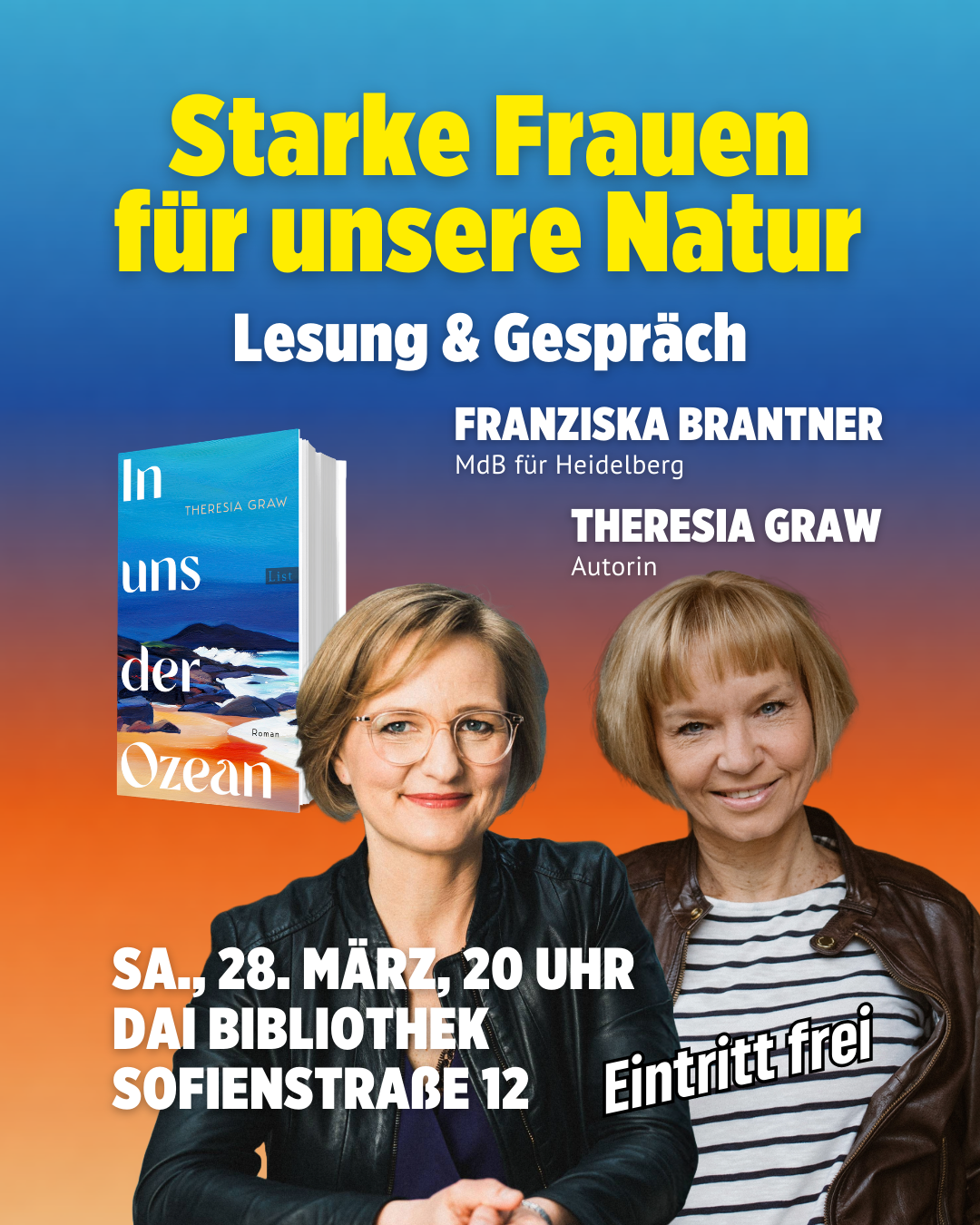 Im Rahmen ihrer Lesereise 2026 stellt die Autorin Theresia Graw ihren neuen Roman „In uns der Ozean“ am Samstag, 28. März 2026, um 20 Uhr in der DAI Bibliothek in Heidelberg, Sofienstraße 12, vor. Die Lesung mit anschließendem Gespräch findet auf Einladung der Heidelberger Bundestagsabgeordneten Dr. Franziska Brantner statt.