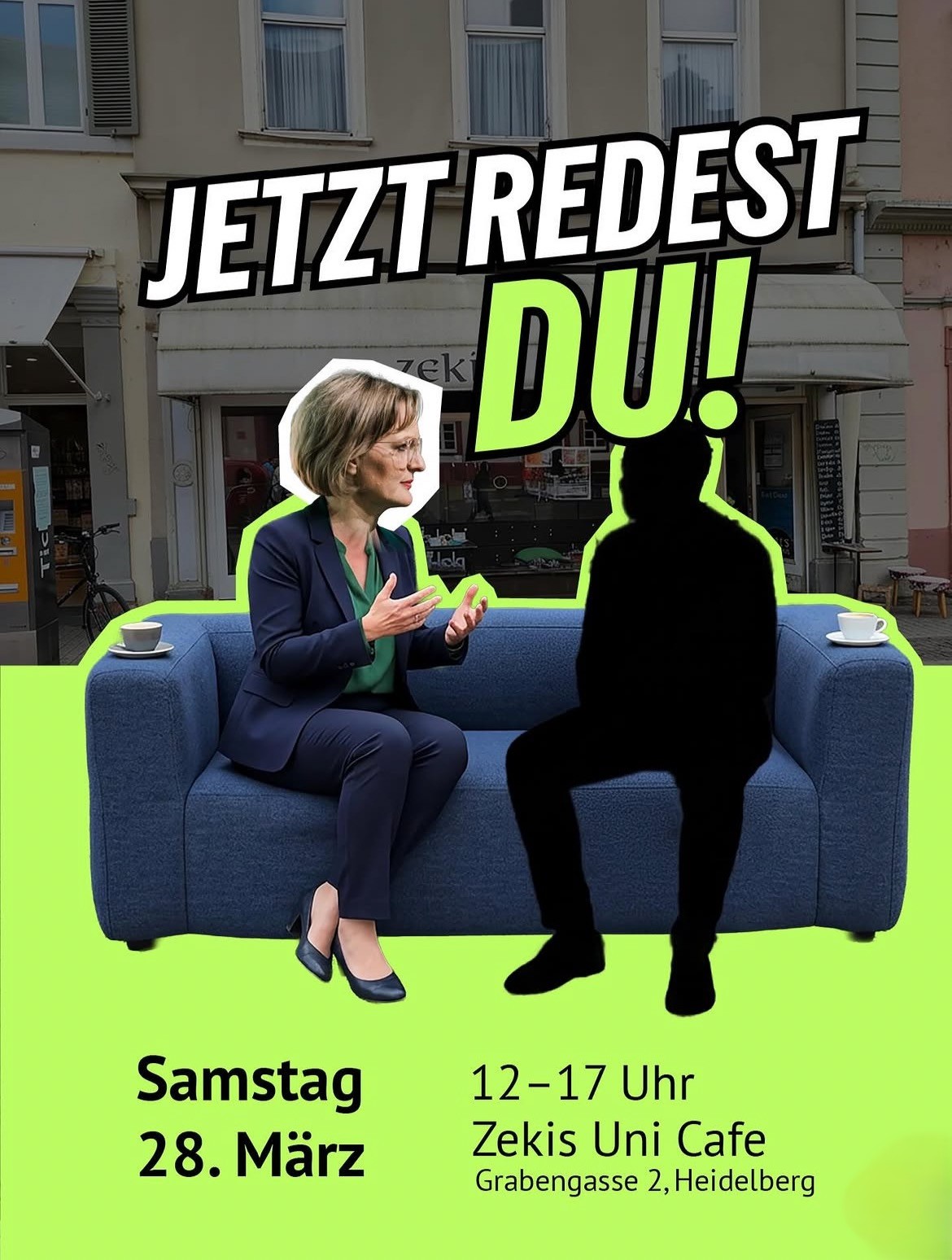 Von 12 bis 17 Uhr sitzt Franziska Brantner in Heidelberg auf ihrer Couch in der Ladenstraße vor Zeki’s Unicafé, Grabengasse 2, 69117 Heidelberg und hört dir zu.