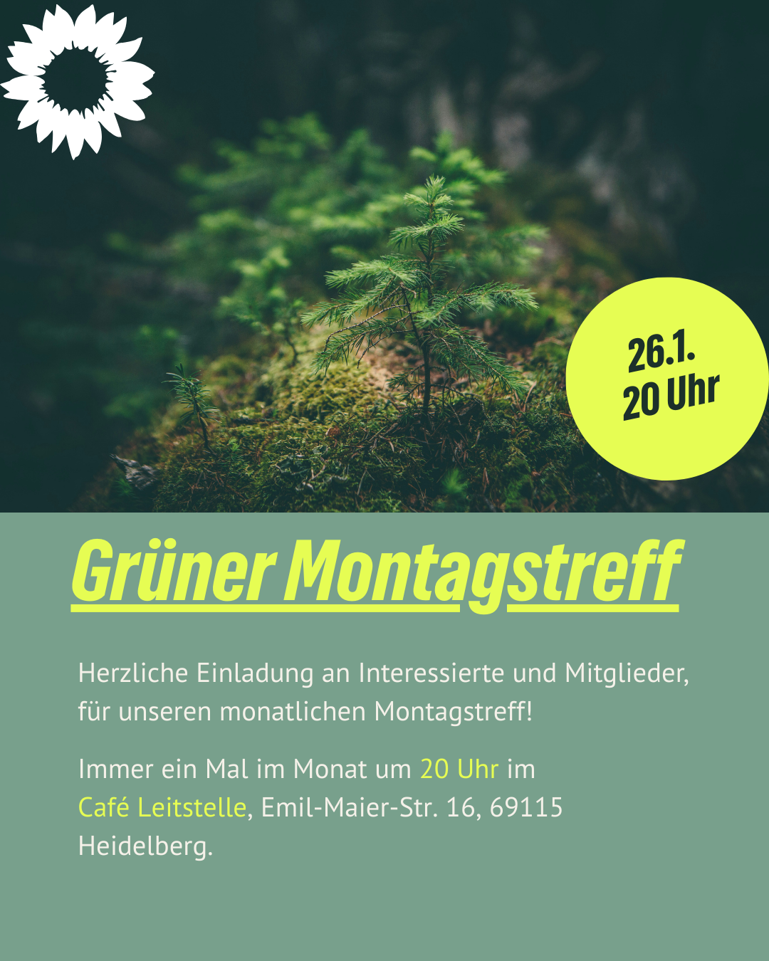 Café Leitstelle im Dezernat 16 Emil-Maier-Straße 16, HeidelbergAm 15. Januar um 19:30 Uhr sprechen Jan Hegenberg und Florian Kollmann darüber, wie der Weg zu 100 % Erneuerbaren konkret aussieht, warum er uns stark und unabhängig macht – und weshalb wir allen Grund haben, mit Zuversicht nach vorne zu schauen.