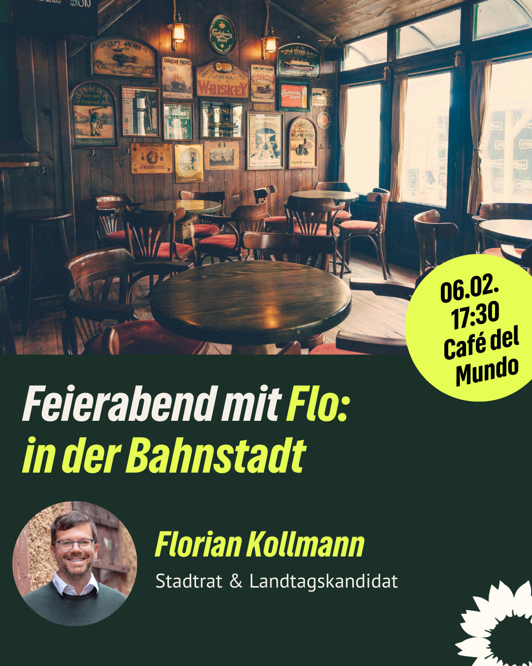 In geselliger Runde kann mit Grünen über grüne und auch weniger grüne Themen diskutiert werden. Mitglieder des Kreisvorstands und der Gemeinderatsfraktion sind auch dabei und stehen zum Austausch und für Fragen zur Verfügung. Herzliche Einladung an alle, für unseren monatlichen Montagstreff! Immer ein mal im Monat um 20 Uhr im Café Leitstelle, Emil-Maier-Str. 16, 69115 Heidelberg. Der Eintritt ist natürlich frei. Eine Anmeldung ist nicht nötig.