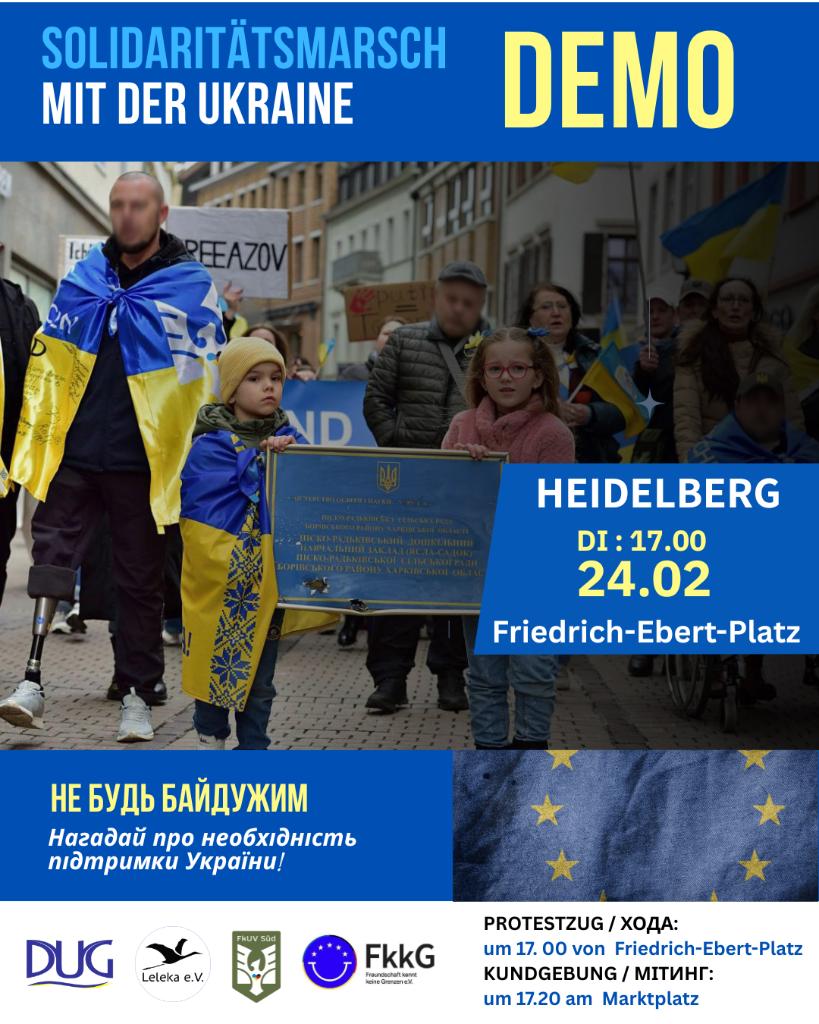 Am 24. Februar lädt die Deutsch-Ukrainische Gesellschaft Rhein-Neckar e.V. Sie herzlich ein, am Solidaritätsmarsch mit der Ukraine und an der friedlichen Demonstration in Heidelberg teilzunehmen.